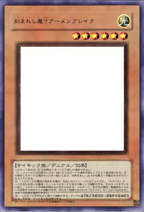 【サイキック族/リンク/効果】 効果を持たないモンスター2体+モンスター0体以上 (1):このカードは相手の効果の対象にならず、自身のカードの効果でこのカードの効果を無効に出来ず、お互いにこのカードを召喚できない。 (2):このカードの元々の攻撃力は10000になる。この効果は無効化されない。 (3):このカードがフィールドに存在する限り、お互いにフィールドのモンスターの攻撃力・守備力を増減する効果を含む効果を適用できない。 (4):お互いは相手フィールドの効果モンスター扱いのカードを通常召喚としてもう1度召喚することができる。その場合そのカードは通常モンスター扱いとなり効果を失う。 (5):このカードがフィールド上に存在する限り、お互いの効果を持たないモンスターはこのカードを除く元々の持ち主以外のカードの効果を受けない。 |