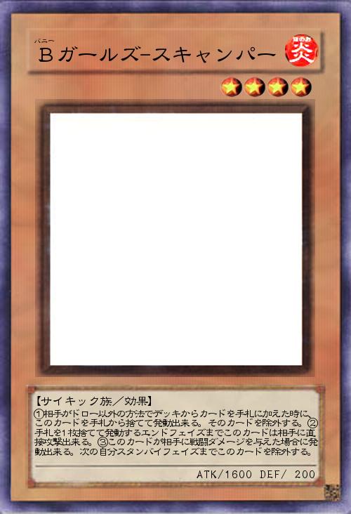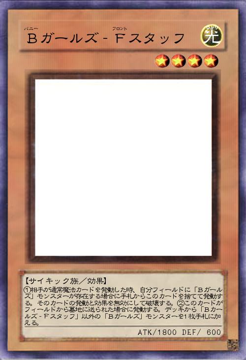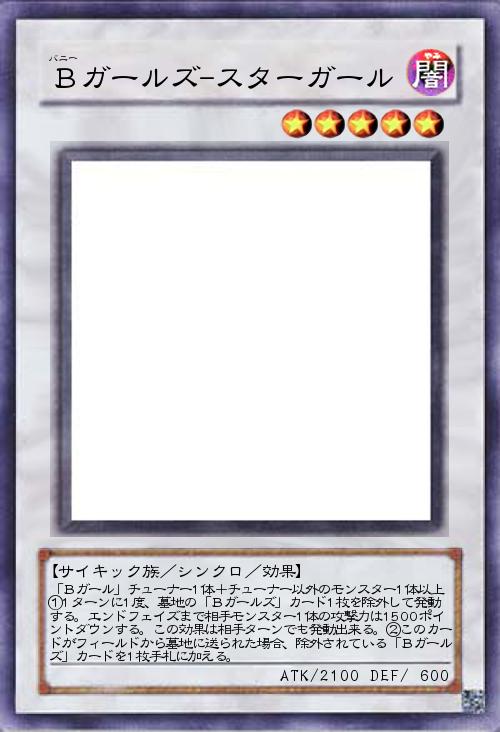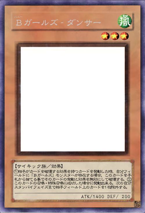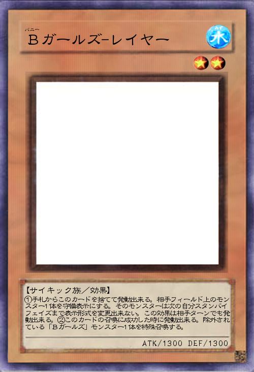 ①1ターンに1度、自分が「Bガールズ」モンスターを特殊召喚した場合に発動出来る。デッキからカードを1枚ドローする。②フィールド上の「Bガールズ」カードが破壊される場合、墓地のこのカードを代わりに除外してもよい。 |