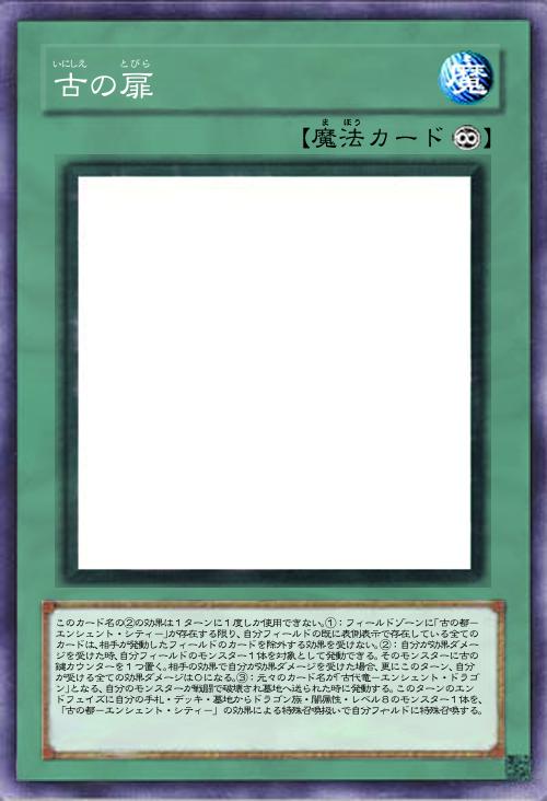 このカード名の②の効果は1ターンに1度しか使用できない。①:フィールドゾーンに「古の都-エンシェント・シティ-」が存在する限り、自分フィールドの既に表側表示で存在している全てのカードは、相手が発動したフィールドのカードを除外する効果を受けない。②:自分が効果ダメージを受けた時、自分フィールドのモンスター1体を対象として発動できる。そのモンスターに古の鍵カウンターを1つ置く。相手の効果で自分が効果ダメージを受けた場合、更にこのターン、自分が受ける全ての効果ダメージは0になる。③:元々のカード名が「古代竜-エンシェント・ドラゴン」となる、自分のモンスターが戦闘で破壊され墓地へ送られた時に発動する。このターンのエンドフェイズに自分の手札・デッキ・墓地からドラゴン族・闇属性・レベル8のモンスター1体を、「古の都-エンシェント・シティ-」の効果による特殊召喚扱いで自分フィールドに特殊召喚する。 |