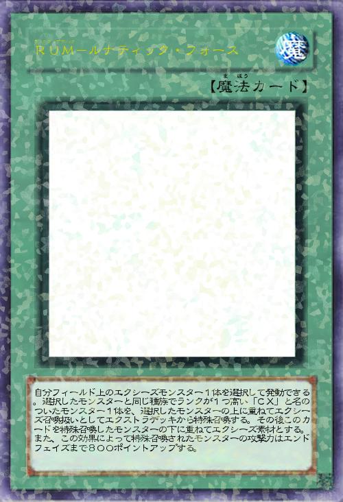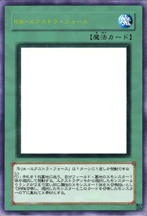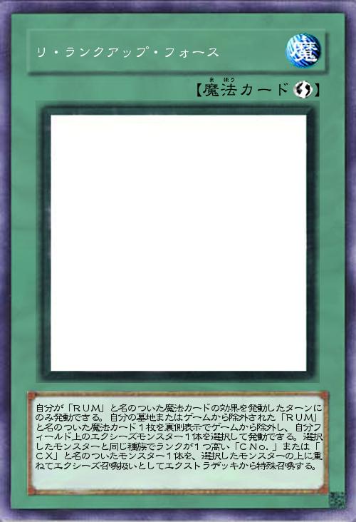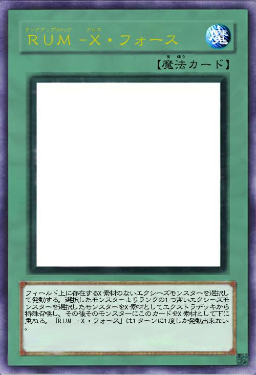 フィールド上に存在するX素材のないエクシーズモンスターを選択して発動する。選択したモンスターよりランクの1つ高いエクシーズモンスターを選択したモンスターをX素材としてエクストラデッキから特殊召喚し、その後そのモンスターにこのカードをX素材として下に重ねる。「RUM -X・フォース」は1ターンに1度しか発動出来ない。 |