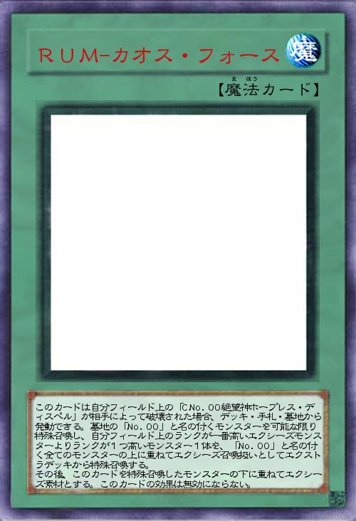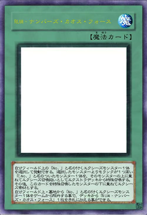 自分が「RUM」と名のついた魔法カードの効果を発動したターンにのみ発動できる。自分の墓地またはゲームから除外された「RUM」と名のついた魔法カード1枚を裏側表示でゲームから除外し、自分フィールド上のエクシーズモンスター1体を選択して発動できる。選択したモンスターと同じ種族でランクが1つ高い「CNo.」または「CX」と名のついたモンスター1体を、選択したモンスターの上に重ねてエクシーズ召喚扱いとしてエクストラデッキから特殊召喚する。 |