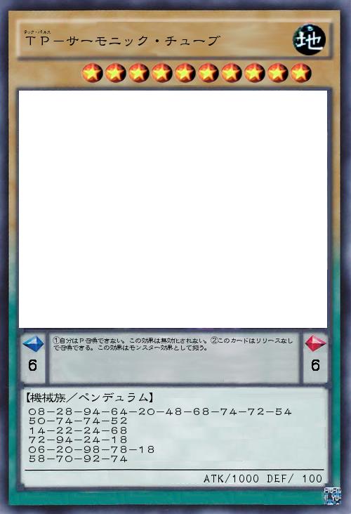 【機械族/ペンデュラム】 08-28-94-64-20-48-68-74-72-54 50-74-74-52 14-22-24-68 72-94-24-18 06-20-98-78-18 58-70-92-74 ①自分はP召喚できない。この効果は無効化されない。②このカードはリリースなしで召喚できる。この効果はモンスター効果として扱う。 |