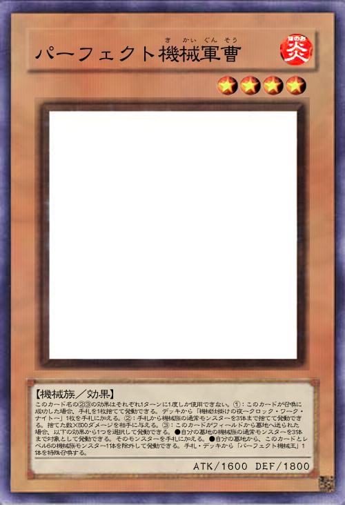 【機械族/効果】 このカード名の②③の効果はそれぞれ1ターンに1度しか使用できない。①:このカードが召喚に成功した場合、手札を1枚捨てて発動できる。デッキから「機械仕掛けの夜ークロック・ワーク・ナイトー」1枚を手札に加える。②:手札から機械族の通常モンスターを3体まで捨てて発動できる。捨てた数×500ダメージを相手に与える。③:このカードがフィールドから墓地へ送られた場合、以下の効果から1つを選択して発動できる。●自分の墓地の機械族の通常モンスターを3体まで対象として発動できる。そのモンスターを手札に加える。●自分の墓地から、このカードとレベル6の機械族モンスター1体を除外して発動できる。手札・デッキから「パーフェクト機械王」1体を特殊召喚する。 |