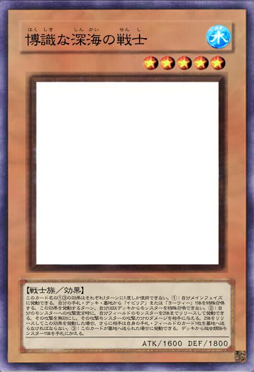 【水族/効果】 このカード名の②③の効果はそれぞれ1ターンに1度しか使用できない。①:このカード以外の自分フィールドのモンスターの攻撃力・守備力は200アップする。②:お互いのスタンバイフェイズに、自分の墓地の攻撃力1300以下の水属性モンスター1体を対象として発動できる。そのモンスターを表側守備表示または裏側守備表示で特殊召喚する。③:相手フィールドに、元々の攻撃力が1600のモンスターを召喚・反転召喚・特殊召喚した時、このカードをリリースし、そのモンスター1体を対象として発動できる。そのモンスターのコントロールを得る。 |