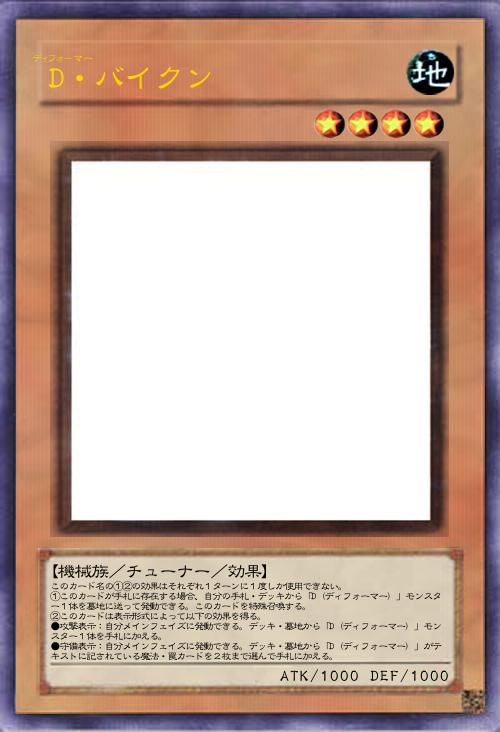 【機械族/チューナー/効果】 このカード名の①②の効果はそれぞれ1ターンに1度しか使用できない。 ①このカードが手札に存在する場合、自分の手札・デッキから「D(ディフォーマー)」モンスター1体を墓地に送って発動できる。このカードを特殊召喚する。 ②このカードは表示形式によって以下の効果を得る。 ●攻撃表示:自分メインフェイズに発動できる。デッキ・墓地から「D(ディフォーマー)」モンスター1体を手札に加える。 ●守備表示:自分メインフェイズに発動できる。デッキ・墓地から「D(ディフォーマー)」がテキストに記されている魔法・罠カードを2枚まで選んで手札に加える。 |