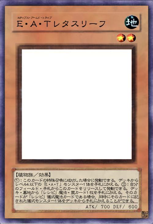 【植物族/効果】 ①:このカードの特殊召喚に成功した場合に発動できる。デッキからレベル4以下の「E・A・T」モンスター1体を手札に加える。②:自分のフィールド・手札からこのカードをリリースして発動できる。デッキ・墓地から「レシピ」魔法・罠カード1枚を手札に加える。そのカードが「レシピ」儀式魔法カードである場合、同時にそのカードに記された儀式モンスター1体をデッキから手札に加えることができる。 |