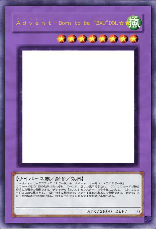 【サイバース族/効果】 このカード名の①②③の効果はそれぞれ1ターンに1度しか使用できない。 ①:このカードが召喚・特殊召喚に成功した場合に発動できる。デッキから「BAU」魔法・罠カード1枚を手札に加える。 ②:自分・相手バトルフェイズに発動できる。自分フィールドのこのカードを装備カード扱いとして「Advent-モココ・アビスガード」に装備する。 ③:このカードを装備したモンスターの攻撃宣言時に発動できる。バトルフェイズ終了時まで、このカードを装備したモンスターの攻撃力を500アップし、装備カード扱いのこのカードを攻撃表示で特殊召喚する。 |