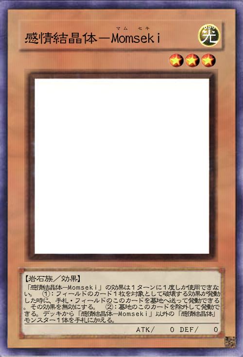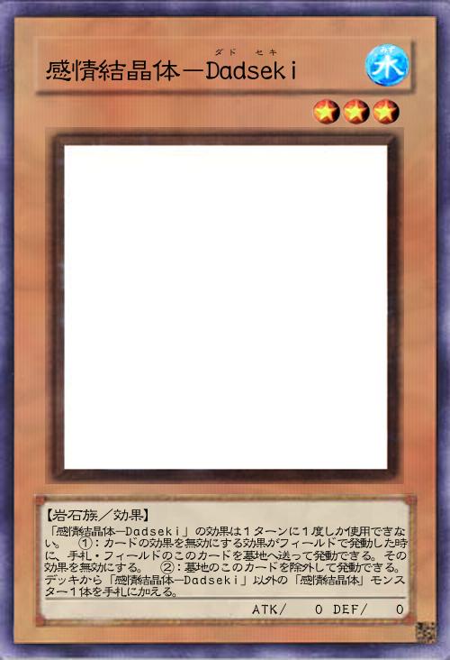【岩石族/効果】 「感情結晶体-Dadseki」の効果は1ターンに1度しか使用できない。 ①:カードの効果を無効にする効果がフィールドで発動した時に、手札・フィールドのこのカードを墓地へ送って発動できる。その効果を無効にする。 ②:墓地のこのカードを除外して発動できる。デッキから「感情結晶体-Dadseki」以外の「感情結晶体」モンスター1体を手札に加える。 |