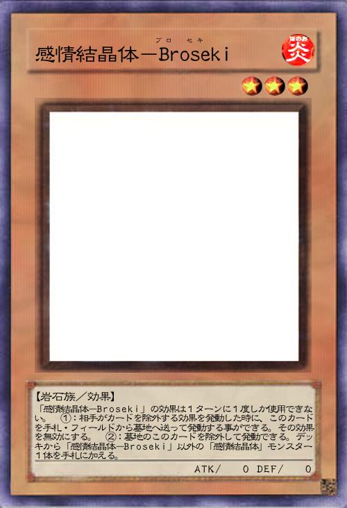 【岩石族/効果】 「感情結晶体-Broseki」の効果は1ターンに1度しか使用できない。 ①:相手がカードを除外する効果を発動した時に、このカードを手札・フィールドから墓地へ送って発動する事ができる。その効果を無効にする。 ②:墓地のこのカードを除外して発動できる。デッキから「感情結晶体-Broseki」以外の「感情結晶体」モンスター1体を手札に加える。 |