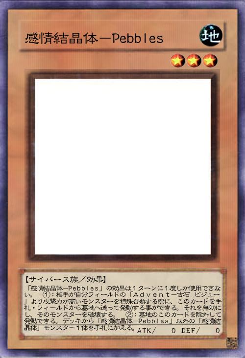【サイバース族/効果】 「感情結晶体-Pebbles」の効果は1ターンに1度しか使用できない。 ①:相手が自分フィールドの「Advent-古石 ビジュー」より攻撃力が高いモンスターを特殊召喚する際に、このカードを手札・フィールドから墓地へ送って発動する事ができる。それを無効にし、そのモンスターを破壊する。 ②:墓地のこのカードを除外して発動できる。デッキから「感情結晶体-Pebbles」以外の「感情結晶体」モンスター1体を手札に加える。 |