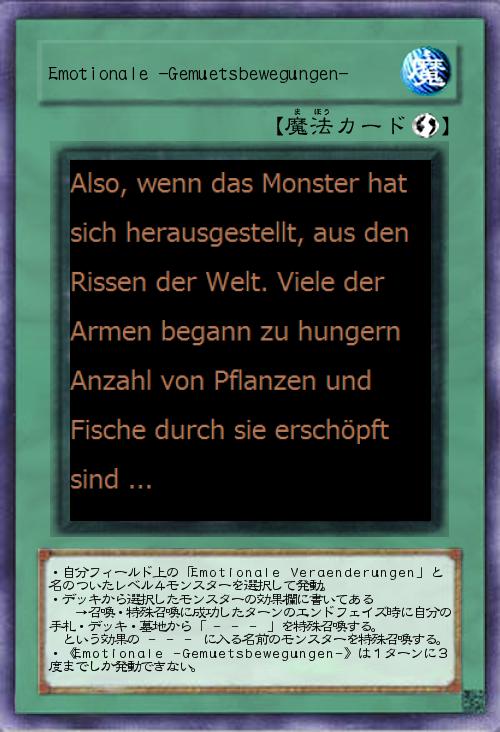 ・自分フィールド上の「Emotionale Veraenderungen」と名のついたレベル4モンスターを選択して発動。〇・デッキから選択したモンスターの効果欄に書いてある〇 →召喚・特殊召喚に成功したターンのエンドフェイズ時に自分の手札・デッキ・墓地から「 - - - 」を特殊召喚する。〇 という効果の - - - に入る名前のモンスターを特殊召喚する。〇・《Emotionale -Gemuetsbewegungen-》は1ターンに3度までしか発動できない。 |