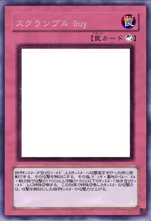 相手モンスタ-が自分フィ-ルド上のモンスタ-へ攻撃宣言を行った時に発動できる.その攻撃を無効にする.その後,デッキ・墓地からレベル4・戦士族で攻撃力1700以上守備力1600以下のモンスタ-1体を自分フィ-ルド上に特殊召喚する.この効果で特殊召喚したモンスタ-の攻撃力は,攻撃を無効にした相手モンスタ-の攻撃力分上がる. |