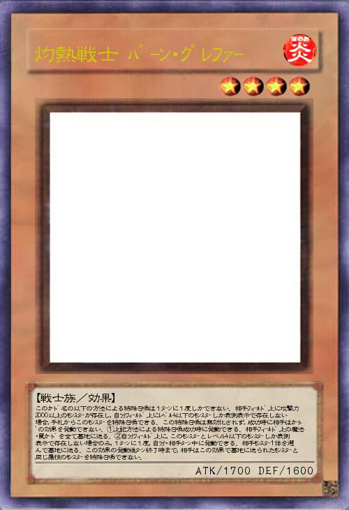 【戦士族/融合/効果】 「グレファ-」モンスタ-+光属性モンスタ-+炎属性モンスタ- 自分フィ-ルド上に表側表示で存在する上記モンスタ-を墓地に送った場合のみ,EXデッキから特殊召喚できる(融合召喚は必要としない.)①このモンスタ-の攻撃力は,自分の墓地に存在するレベル4・戦士族モンスタ-の数×300アップする.②このモンスタ-が,相手に戦闘ダメ-ジを与えた場合に発動できる.デッキからレベル4・戦士族で攻撃力1700以上守備力1600以下のモンスタ-1体を自分フィ-ルド上に特殊召喚する.③このモンスタ-が,戦闘または効果で破壊された場合に,自分の墓地に存在する「グレファ-」モンスタ-を2体まで選択して発動できる.そのモンスタ-を自分フィ-ルド上に特殊召喚する.この効果で特殊召喚したモンスタ-は,EXデッキからモンスタ-を特殊召喚する際の素材にできない. |
