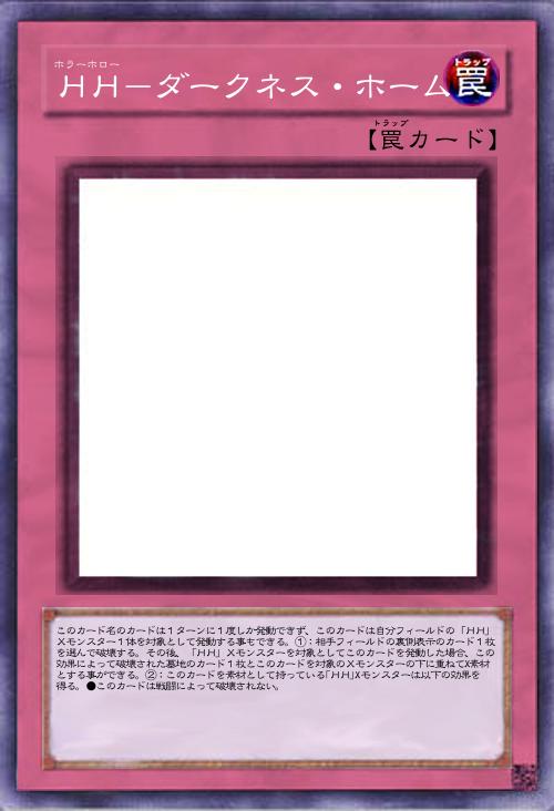 このカード名のカードは1ターンに1度しか発動できない。①:自分のデッキ・EXデッキから「HH」モンスター1体を選んで墓地へ送る。その後、自分フィールドにモンスターが存在しない場合、自分の墓地の「HH」モンスター1体を手札に加える事ができる。②:このカードを素材として持っている「HH」Xモンスターは以下の効果を得る。●このカードの効果は相手によって無効化されない。 |