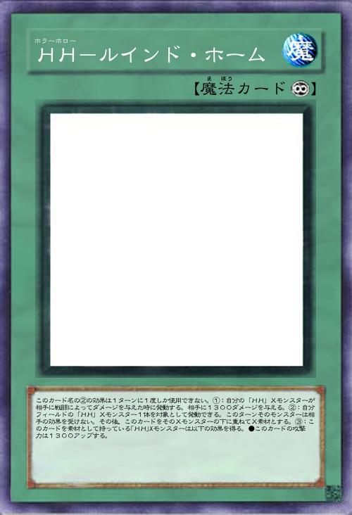 このカード名の②の効果は1ターンに1度しか使用できない。①:自分の「HH」Xモンスターが相手に戦闘によってダメージを与えた時に発動する。相手に1300ダメージを与える。②:自分フィールドの「HH」Xモンスター1体を対象として発動できる。このターンそのモンスターは相手の効果を受けない。その後、このカードをそのXモンスターの下に重ねてX素材とする。③:このカードを素材として持っている「HH」Xモンスターは以下の効果を得る。●このカードの攻撃力は1300アップする。 |