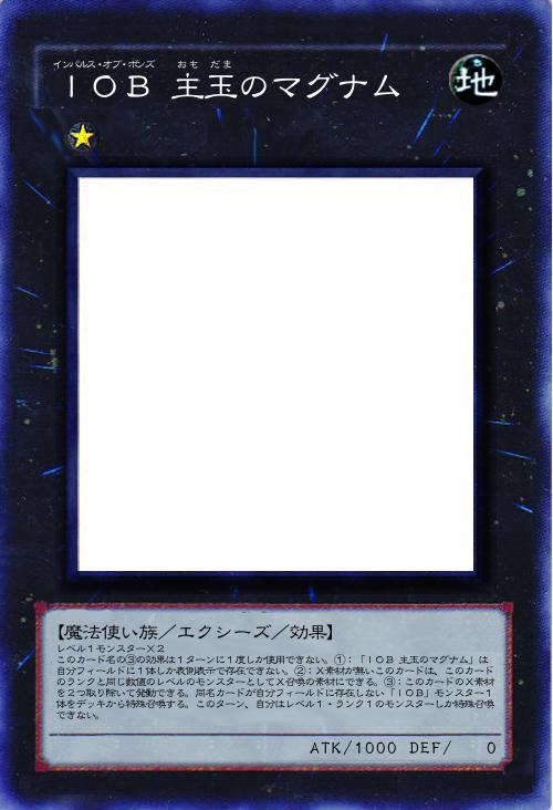 【魔法使い族/エクシーズ/効果】 レベル1モンスター×2 このカード名の③の効果は1ターンに1度しか使用できない。①:「IOB 主玉のマグナム」は自分フィールドに1体しか表側表示で存在できない。②:X素材が無いこのカードは、このカードのランクと同じ数値のレベルのモンスターとしてX召喚の素材にできる。③:このカードのX素材を2つ取り除いて発動できる。同名カードが自分フィールドに存在しない「IOB」モンスター1体をデッキから特殊召喚する。このターン、自分はレベル1・ランク1のモンスターしか特殊召喚できない。 |