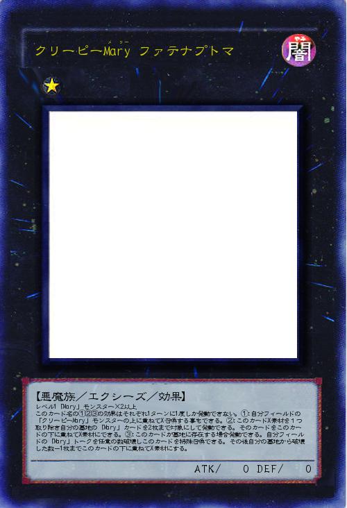 このカード名はルール上「Mary」カードとして扱う。このカード名の①③の効果は1ターンに1度いずれかしか発動できない。①:自分フィールドの「クリーピーMary」Xモンスターを1体選んで発動できる。そのモンスターのよりランクが高い「Mary」モンスター1体を、選んだモンスターの上に重ねてX召喚扱いとしてEXデッキから特殊召喚できる。その後このカードをフィールドのXモンスターの下に重ねてX素材にすることができる。②:このカードをエクシーズ素材としているモンスターは以下の効果を得る。●このカードのX素材を1つ取り除いて発動できる。フィールドのカードを2枚まで選んでこのカードの下に重ねてX素材にできる。この効果は相手ターンでも発動できる。③:自分フィールドの「Mary」カードが相手によってフィールドから離れる場合墓地のこのカードを代わりに除外できる。 |