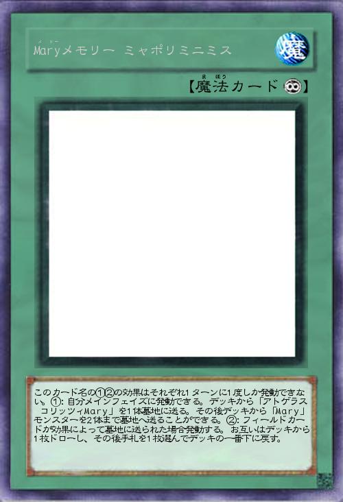 このカード名の①②の効果はそれぞれ1ターンに1度しか発動できない。①:自分メインフェイズに発動できる。デッキから「アトゲラス コリッツィMary」を1体墓地に送る。その後デッキから「Mary」モンスターを2体まで墓地へ送ることができる。②:フィールドカードが効果によって墓地に送られた場合発動する。お互いはデッキから1枚ドローし、その後手札を1枚選んでデッキの一番下に戻す。 |
