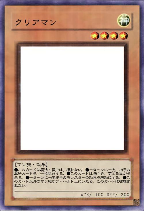 【マン族・効果】 ●このカードは魔法・罠では、壊れない。●一ターンに一度、相手の墓地カードを、一枚除外する。●このカードは属性を、変える事が出来る。●一ターンに一度相手のモンスターの効果を無効にする。●このカード以外のマン族がフィールド上にいたら、このカードは破壊されない。 |