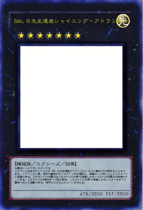【機械族/エクシーズ/効果】 光属性レベル7モンスター×3 このカードは自分フィールドの「No.6先史遺産アトランタル」の上に重ねてX召喚することもできる。1ターンに一度、相手の墓地のモンスター1体を選択し、装備カード扱いとしてこのカードに装備できる。このカードの攻撃力はこのカードの効果で装備したモンスターの攻撃力の数値分アップする。このカードのX素材を一つ取り除き、このカードの効果で装備したモンスターをすべて墓地へ送って発動できる。相手に2000ダメージを与える。 |