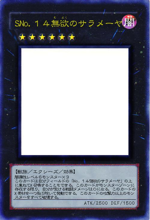 【獣族/エクシーズ/効果】 闇属性レベル6モンスター×3 このカードは自分フィールドの「No.14強欲のサラメーヤ」の上に重ねてX召喚することもできる。このカードがモンスターゾーンに存在する限り、自分が受ける戦闘ダメージは0になる。このカードのX素材を一つ取り除いて発動できる。このカードの攻撃力以上のモンスターをすべて破壊する。 |