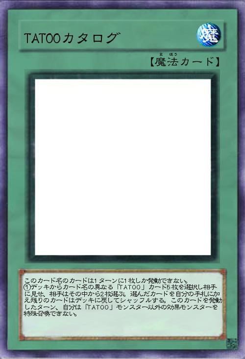 このカード名のカードは1ターンに1枚しか発動できない。 ①デッキからカード名の異なる「TATOO」カード5枚を選択し相手に見せ、相手はその中から2枚選ぶ。選んだカードを自分の手札に加え残りのカードはデッキに戻してシャッフルする。このカードを発動したターン、自分は「TATOO」モンスター以外の効果モンスターを特殊召喚できない。 |