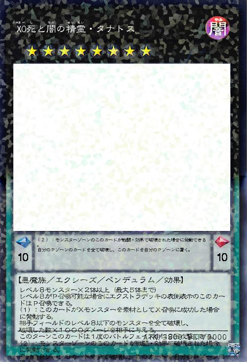 【悪魔族/エクシーズ/ペンデュラム/効果】 レベル8モンスター×2体以上(最大5体まで) レベル8がP召喚可能な場合にエクストラデッキの表側表示のこのカードはP召喚できる。 (1):このカードがXモンスターを素材としてX召喚に成功した場合に発動する。 相手フィールドのレベル8以下のモンスターを全て破壊し、 破壊した数×1000ダメージを相手に与える。 このターンこのカードは1度のバトルフェイズ中に3回攻撃できる。 (2):モンスターゾーンのこのカードが戦闘・効果で破壊された場合に発動できる。 自分のPゾーンのカードを全て破壊し、このカードを自分のPゾーンに置く。 (2):モンスターゾーンのこのカードが戦闘・効果で破壊された場合に発動できる。 自分のPゾーンのカードを全て破壊し、このカードを自分のPゾーンに置く。 |