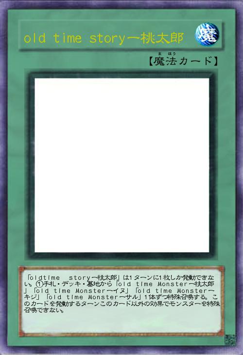 「oldtime storyー桃太郎」は1ターンに1枚しか発動できない。①手札・デッキ・墓地から「old time Monsterー桃太郎」「old time Monsterーイヌ」「old time Monsterーキジ」「old time Monsterーサル」1体ずつ特殊召喚する。このカードを発動するターンこのカード以外の効果でモンスターを特殊召喚できない。 |