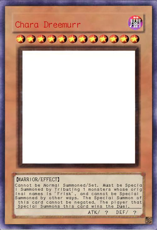 【WARRIOR/EFFECT】 Cannot be Normal Summoned/Set. Must be Special Summoned by Tributing 1 monsters whose original names is 'Frisk', and cannot be Special Summoned by other ways. The Special Summon of this card cannot be negated. The player that Special Summons this card wins the Duel. |