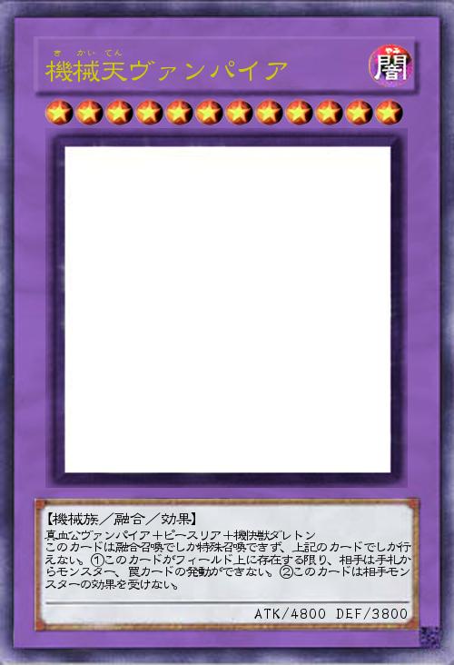| 真血公ヴァンパイア+ピースリア+機快獣ダレトン このカードは融合召喚でしか特殊召喚できず、上記のカードでしか行えない。①このカードがフィールド上に存在する限り、相手は手札からモンスター、罠カードの発動ができない。②このカードは相手モンスターの効果を受けない。 | |||