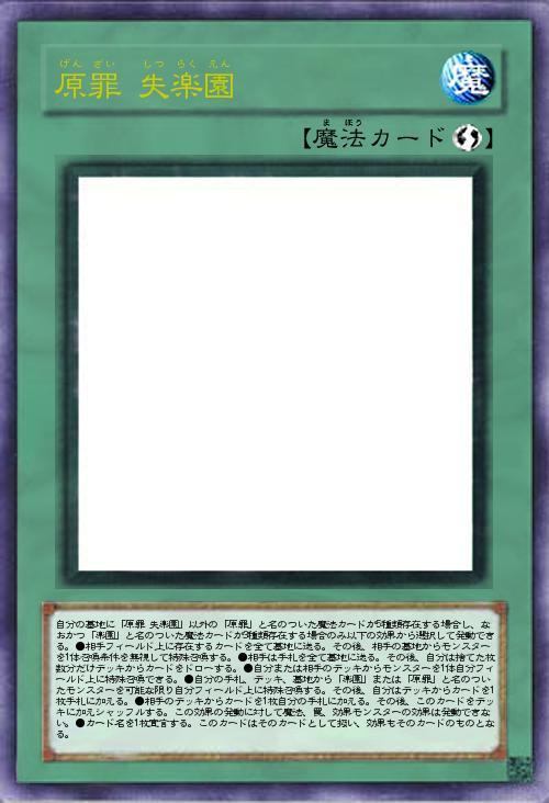 | 自分の墓地に「原罪 失楽園」以外の「原罪」と名のついた魔法カードが5種類存在する場合し、なおかつ「楽園」と名のついた魔法カードが3種類存在する場合のみ以下の効果から選択して発動できる。●相手フィールド上に存在するカードを全て墓地に送る。その後、相手の墓地からモンスターを1体召喚条件を無視して特殊召喚する。●相手は手札を全て墓地に送る。その後、自分は捨てた枚数分だけデッキからカードをドローする。●自分または相手のデッキからモンスターを1体自分フィールド上に特殊召喚できる。●自分の手札、デッキ、墓地から「楽園」または「原罪」と名のついたモンスターを可能な限り自分フィールド上に特殊召喚する。その後、自分はデッキからカードを1枚手札に加える。●相手のデッキからカードを1枚自分の手札に加える。その後、このカードをデッキに加えシャッフルする。この効果の発動に対して魔法、罠、効果モンスターの効果は発動で | |||