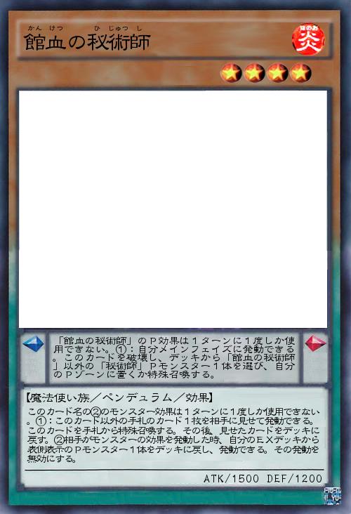 | 「館血の秘術師」のP効果は1ターンに1度しか使用できない。①:自分メインフェイズに発動できる。このカードを破壊し、デッキから「館血の秘術師」以外の「秘術師」Pモンスター1体を選び、自分のPゾーンに置くか特殊召喚する。 | |||
