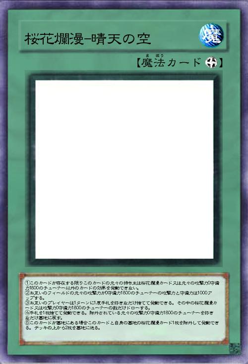 | ①このカードが存在する限りこのカードの元々の持ち主は桜花爛漫カード又は元々の攻撃力0守備力1800のチューナー以外のカードの効果を発動できない。 ②お互いのフィールドの元々の攻撃力が0守備力1800のチューナーの攻撃力と守備力は1000アップする。 ③お互いのプレイヤーは1ターンに1度手札を好きなだけ捨てて発動できる。その中の桜花爛漫カード又は攻撃力0守備力1800のチューナーの数だけドローする。 ④手札を1枚捨てて発動できる。除外されている元々の攻撃力0守備力1800のチューナーを好きなだけ墓地に戻す。 ⑤このカードが墓地にある場合このカードと自身の墓地の桜花爛漫カード1枚を除外して発動できる。デッキの上から2枚を墓地に送る。 | |||