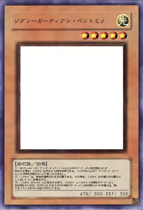 | (1):自分フィールドに「ジグソーガーディアン・ペントミノ」以外の「ガーディアン」岩石族モンスターが存在する場合、このカードは手札から特殊召喚できる。この方法による「ジグソーガーディアン・ペントミノ」の特殊召喚は1ターンに1度しかできない。 (2):このカードは、表側守備表示のまま攻撃できる。その場合、このカードは守備力を攻撃力として扱いダメージ計算を行う。 (3):このカードがフィールド上に存在する限り、このカードとこのカードの両隣の「ガーディアン」岩石族モンスター及び、そのモンスターのもう片方の隣の「ガーディアン」岩石族モンスターの守備力は、隣り合っているモンスターの数×500アップする。 | |||