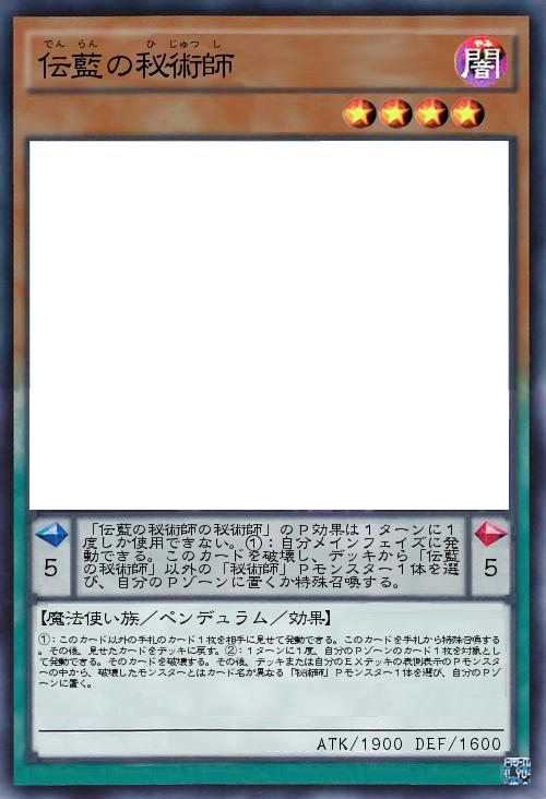 | 「伝藍の秘術師の秘術師」のP効果は1ターンに1度しか使用できない。①:自分メインフェイズに発動できる。このカードを破壊し、デッキから「伝藍の秘術師」以外の「秘術師」Pモンスター1体を選び、自分のPゾーンに置くか特殊召喚する。 | |||
