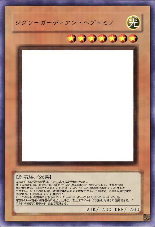 | このカード名の(3)の効果は、1ターンに1度しか発動できない。 (1):このカードは、自分フィールドの「ガーディアン」岩石族モンスター1体をリリースして、手札から特殊召喚できる。この方法による「ジグソーガーディアン・ヘプトミノ」の特殊召喚は1ターンに1度しかできない。(2):このカードは、表側守備表示のまま攻撃できる。その場合、このカードは守備力を攻撃力として扱いダメージ計算を行う。 (3):このカードの両隣のどちらかに「ジグソーガーディアン・ヘプトミノ」以外の「ガーディアン」岩石族モンスターが召喚・特殊召喚に成功した場合、または下にカードが発動した場合に発動できる。このカードの縦列の相手カードを全て破壊する。 | |||