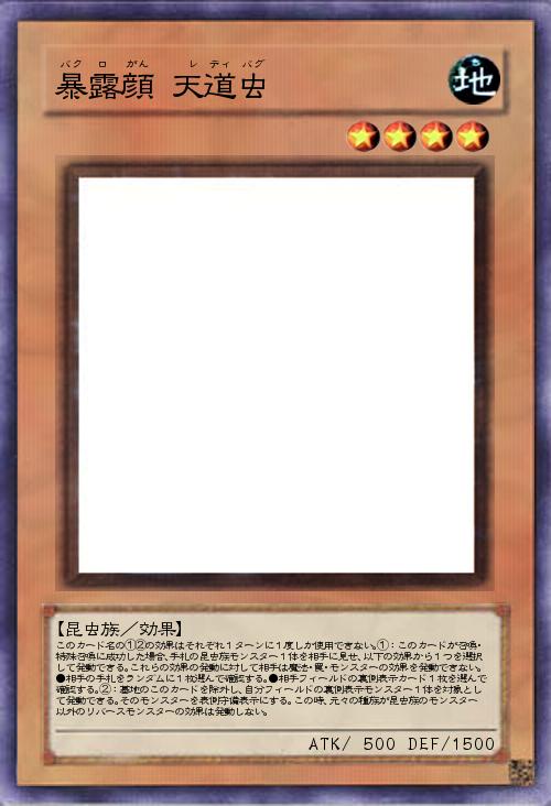 | このカード名の①②の効果はそれぞれ1ターンに1度しか使用できない。①:このカードが召喚・特殊召喚に成功した場合、手札の昆虫族モンスター1体を相手に見せ、以下の効果から1つを選択して発動できる。これらの効果の発動に対して相手は魔法・罠・モンスターの効果を発動できない。●相手の手札をランダムに1枚選んで確認する。●相手フィールドの裏側表示カード1枚を選んで確認する。②:墓地のこのカードを除外し、自分フィールドの裏側表示モンスター1体を対象として発動できる。そのモンスターを表側守備表示にする。この時、元々の種族が昆虫族のモンスター以外のリバースモンスターの効果は発動しない。 | |||