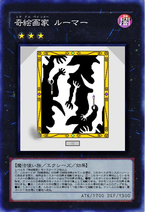 | レベル3「奇絵画家」モンスター×2体以上 ①:このカードが「絵画奔放」の効果で特殊召喚されている場合、このカードがモンスターゾーンに存在する限り、相手はモンスターの効果を発動できない。②:このカードがX素材としているモンスターの属性によって、このカードは以下の効果を得る。●闇:このカードのX素材を1つ取り除き、フィールドの表側表示モンスター1体を対象として発動できる。そのモンスターの効果を無効にする。●炎:このカードの攻撃力・守備力は、このカードのX素材の数×400アップする。●風:1ターンに1度、このカードのX素材を1つ取り除いて発動できる。フィールドの魔法・罠カード1枚を選んで墓地へ送る。 | |||