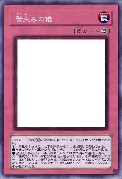| このカード名の①②の効果はそれぞれ1ターンに1度しか使用できない。 ①:手札を1枚捨て、以下の効果から1つを選択して発動できる。 ●自分のデッキ・墓地から「誕生呪い」1枚を選んで手札に加える。 ●自分及び相手フィールドのカードを1枚ずつ選んで墓地へ送る。 ②:儀式モンスターが自分の墓地へ送られた場合、その儀式モンスター1体を対象として発動できる。対象のモンスターとはカード名が異なる儀式モンスター1体をデッキから墓地へ送り、対象のモンスターを手札に加える。 | |||