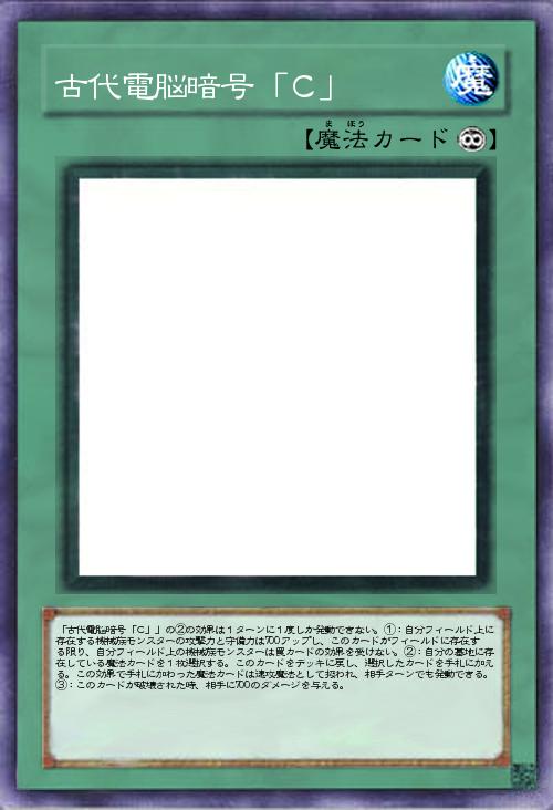 | 「古代電脳暗号「C」」の②の効果は1ターンに1度しか発動できない。①:自分フィールド上に存在する機械族モンスターの攻撃力と守備力は700アップし、このカードがフィールドに存在する限り、自分フィールド上の機械族モンスターは罠カードの効果を受けない。②:自分の墓地に存在している魔法カードを1枚選択する。このカードをデッキに戻し、選択したカードを手札に加える。この効果で手札に加わった魔法カードは速攻魔法として扱われ、相手ターンでも発動できる。③:このカードが破壊された時、相手に700のダメージを与える。 | |||