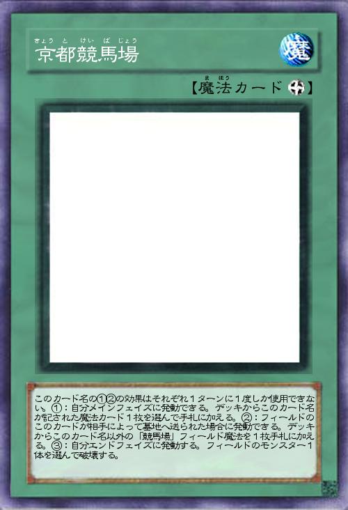 | このカード名の①②の効果はそれぞれ1ターンに1度しか使用できない。①:自分メインフェイズに発動できる。デッキからこのカード名が記された魔法カード1枚を選んで手札に加える。②:フィールドのこのカードが相手によって墓地へ送られた場合に発動できる。デッキからこのカード名以外の「競馬場」フィールド魔法を1枚手札に加える。③:自分エンドフェイズに発動する。フィールドのモンスター1体を選んで破壊する。 | |||