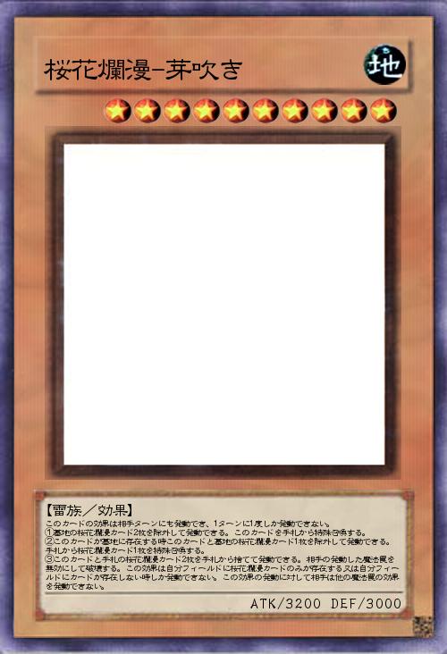 | このカードの効果は相手ターンにも発動でき、1ターンに1度しか発動できない。 ①墓地の桜花爛漫カード2枚を除外して発動できる。このカードを手札から特殊召喚する。 ②このカードが墓地に存在する時このカードと墓地の桜花爛漫カード1枚を除外して発動できる。手札から桜花爛漫カード1枚を特殊召喚する。 ③このカードと手札の桜花爛漫カード2枚を手札から捨てて発動できる。相手の発動した魔法罠を無効にして破壊する。この効果は自分フィールドに桜花爛漫カードのみが存在する又は自分フィールドにカードが存在しない時しか発動できない。この効果の発動に対して相手は他の魔法罠の効果を発動できない。 | |||