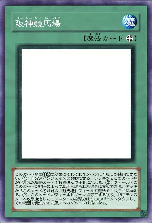 | このカード名の①②の効果はそれぞれ1ターンに1度しか使用できない。①:自分メインフェイズに発動できる。デッキからこのカード名が記された魔法カード1枚を選んで手札に加える。②:フィールドのこのカードが相手によって墓地へ送られた場合に発動できる。デッキからこのカード名以外の「競馬場」フィールド魔法を1枚手札に加える。③:このカードがフィールドゾーンに存在する限り、相手モンスターへ攻撃宣言したモンスターの攻撃力は500ポイントダウンし、その戦闘で発生するお互いへのダメージは倍になる。 | |||