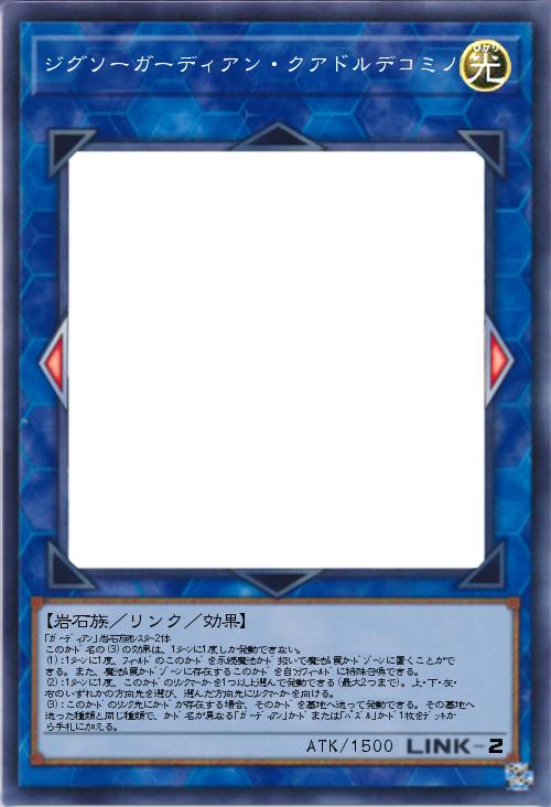 | 「ガーディアン」岩石族モンスター2体 このカード名の(3)の効果は、1ターンに1度しか発動できない。 (1):1ターンに1度、フィールドのこのカードを永続魔法カード扱いで魔法&罠カードゾーンに置くことができる。また、魔法&罠カードゾーンに存在するこのカードを自分フィールドに特殊召喚できる。 (2):1ターンに1度、このカードのリンクマーカーを1つ以上選んで発動できる(最大2つまで)。上・下・左・右のいずれかの方向先を選び、選んだ方向先にリンクマーカーを向ける。 (3):このカードのリンク先にカードが存在する場合、そのカードを墓地へ送って発動できる。その墓地へ送った種類と同じ種類で、カード名が異なる「ガーディアン」カードまたは「パズル」カード1枚をデッキから手札に加える。 | |||
