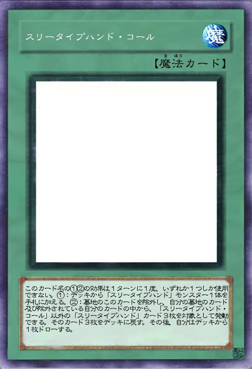 | このカード名の①②の効果は1ターンに1度、いずれか1つしか使用できない。①:デッキから「スリータイプハンド」モンスター1体を手札に加える。②:墓地のこのカードを除外し、自分の墓地のカード及び除外されている自分のカードの中から、「スリータイプハンド・コール」以外の「スリータイプハンド」カード3枚を対象として発動できる。そのカード3枚をデッキに戻す。その後、自分はデッキから1枚ドローする。 | |||
