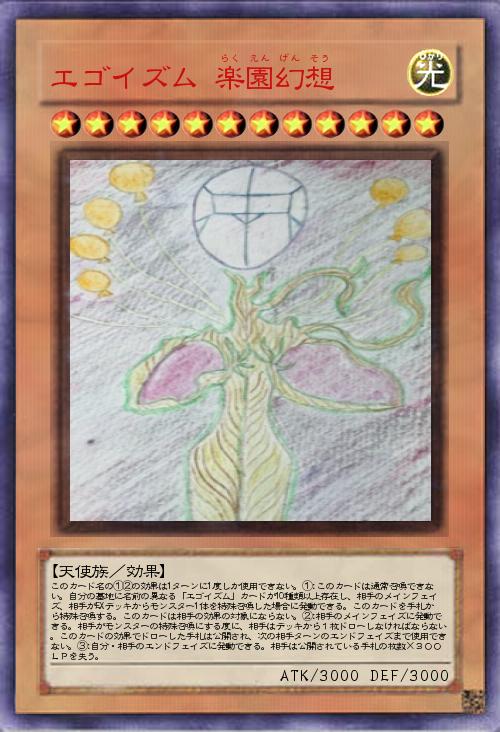 | このカード名の①②の効果は1ターンに1度しか使用できない。①:このカードは通常召喚できない。自分の墓地に名前の異なる「エゴイズム」カードが10種類以上存在し、相手のメインフェイズ、相手がEXデッキからモンスター1体を特殊召喚した場合に発動できる。このカードを手札から特殊召喚する。このカードは相手の効果の対象にならない。②:相手のメインフェイズに発動できる。相手がモンスターの特殊召喚にする度に、相手はデッキから1枚ドローしなければならない。このカードの効果でドローした手札は公開され、次の相手ターンのエンドフェイズまで使用できない。③:自分・相手のエンドフェイズに発動できる。相手は公開されている手札の枚数×300LPを失う。 | |||