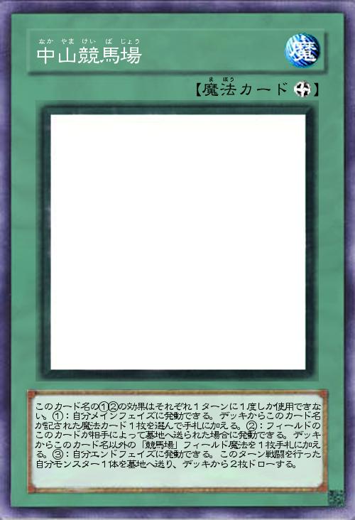 | このカード名の①②の効果はそれぞれ1ターンに1度しか使用できない。①:自分メインフェイズに発動できる。デッキからこのカード名が記された魔法カード1枚を選んで手札に加える。②:フィールドのこのカードが相手によって墓地へ送られた場合に発動できる。デッキからこのカード名以外の「競馬場」フィールド魔法を1枚手札に加える。③:自分エンドフェイズに発動できる。このターン戦闘を行った自分モンスター1体を墓地へ送り、デッキから2枚ドローする。 | |||