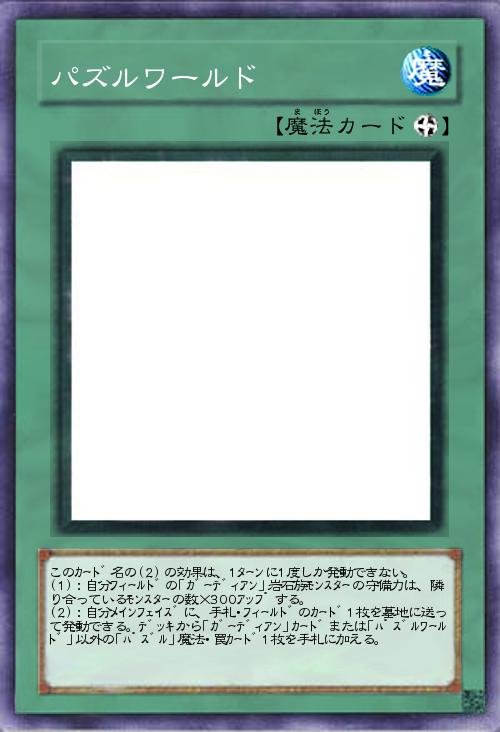 | このカード名の(2)の効果は、1ターンに1度しか発動できない。 (1):自分フィールドの「ガーディアン」岩石族モンスターの守備力は、隣り合っているモンスターの数×300アップする。 (2):自分メインフェイズに、手札・フィールドのカード1枚を墓地に送って発動できる。デッキから「ガーディアン」カードまたは「パズルワールド」以外の「パズル」魔法・罠カード1枚を手札に加える。 | |||