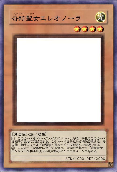 | ①:このカードをドローフェイズにドローした時、手札のこのカードを相手に見せて発動できる。このカードを手札から特殊召喚する。その後、相手フィールドの魔法・罠カード1枚を選んで破壊できる。 ②:このカードが墓地に存在する限り、自分が手札から「奇跡聖女」モンスターを相手に見せる度に相手に100ダメージを与える。 | |||