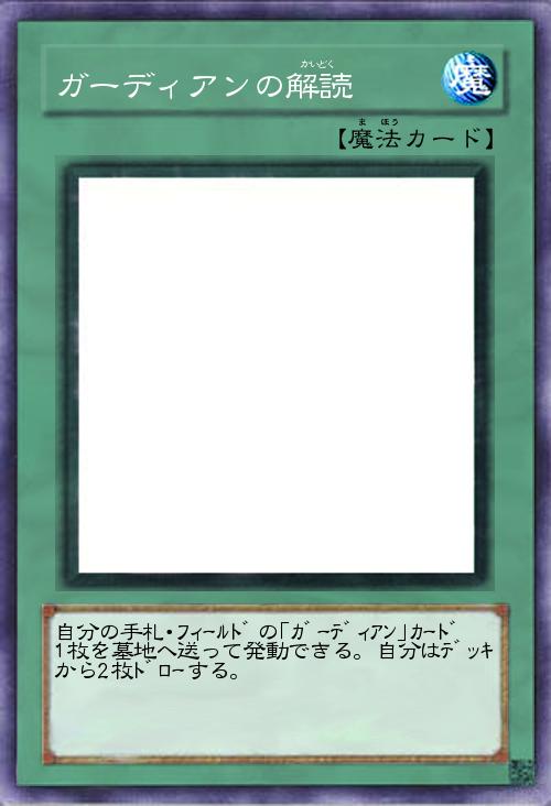 | 自分の手札・フィールドの「ガーディアン」カード1枚を墓地へ送って発動できる。自分はデッキから2枚ドローする。 | |||